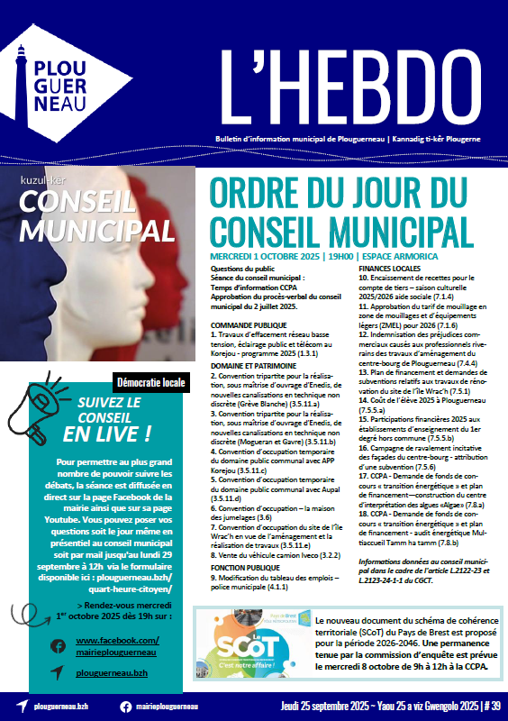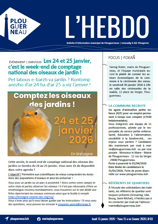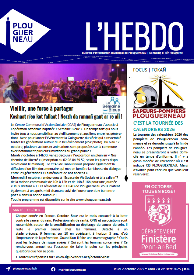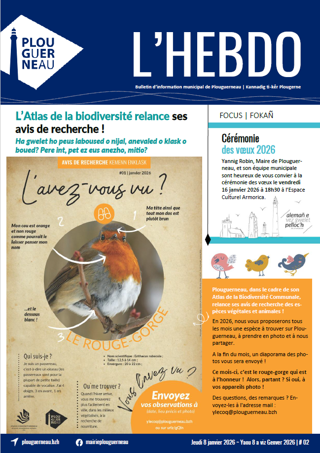 Qu’on l’appelle l’Hebdo, le Bim, le Kannadig ou même le Prône, nous parlons tous du même support : le bulletin d’information municipal de la commune de Plouguerneau. Tiré à près de 2 000 exemplaires, l’Hebdo concentre une diversité d’informations qui n’est autre que le reflet du dynamisme de ses associations, de ses commerçants et de ses habitants. Que ce soit pour se tenir au courant de l’avancée des petits comme des grands projets, de connaître les événements sportifs et culturels municipaux et associatifs ou simplement consulter les offres commerciales et les petites annonces, vous trouverez toujours une excuse pour feuilleter l’Hebdo.