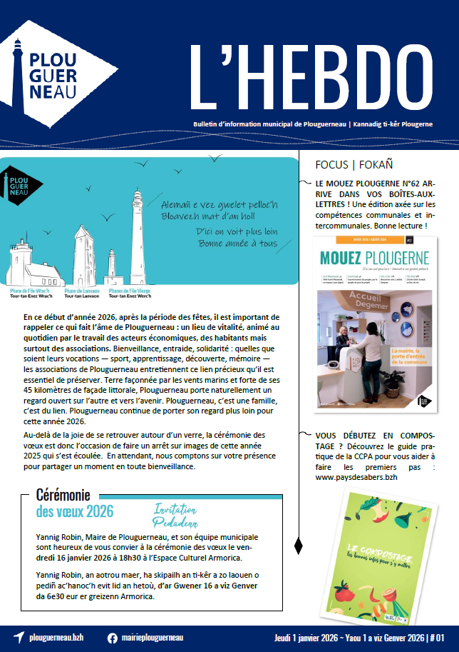 Qu’on l’appelle l’Hebdo, le Bim, le Kannadig ou même le Prône, nous parlons tous du même support : le bulletin d’information municipal de la commune de Plouguerneau. Tiré à près de 2 000 exemplaires, l’Hebdo concentre une diversité d’informations qui n’est autre que le reflet du dynamisme de ses associations, de ses commerçants et de ses habitants. Que ce soit pour se tenir au courant de l’avancée des petits comme des grands projets, de connaître les événements sportifs et culturels municipaux et associatifs ou simplement consulter les offres commerciales et les petites annonces, vous trouverez toujours une excuse pour feuilleter l’Hebdo.