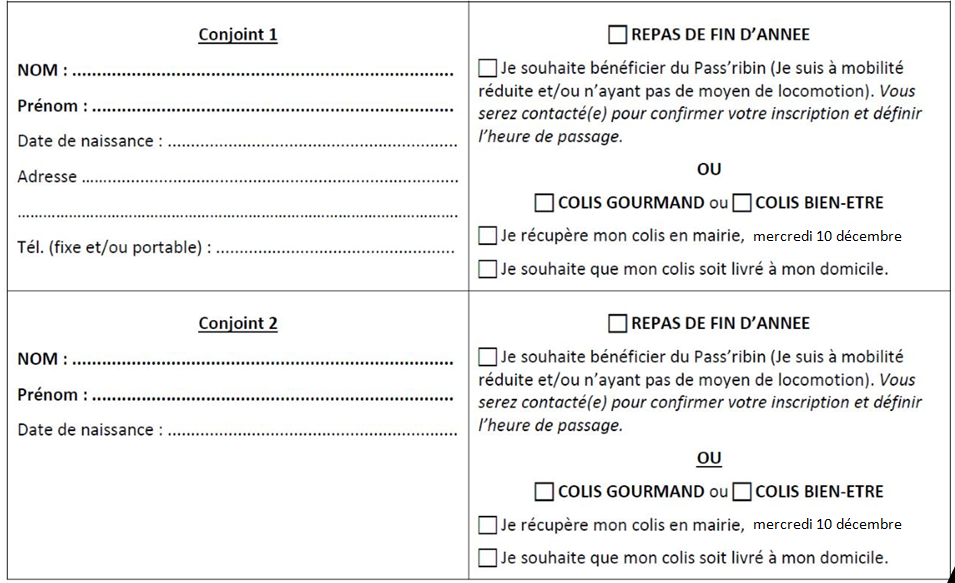 Les personnes de 80 ans ou plus ont le choix du repas ou du colis. Quant aux personnes de moins de 80 ans dont l’état de santé ne leur permet pas de venir au repas, elles peuvent demander un colis, qui leur sera remis à domicile courant décembre.